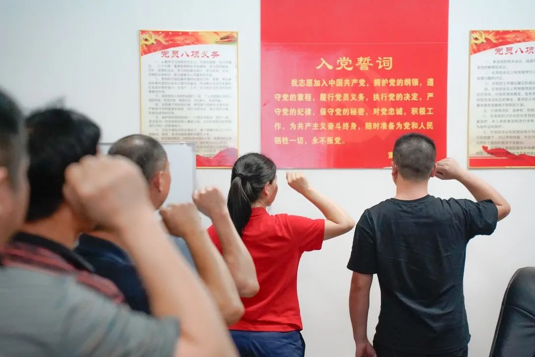 在入黨介紹人陳明同志的領誓下,李海燕同志及全體黨員宣讀了入黨誓詞。參會同志們全體站立,表情嚴肅眼神堅定,懷著為共產主義事業奮斗終身的信念,舉起右手莊嚴宣誓,錚錚誓言在大家耳邊縈繞,紅色種子在新黨員的心中悄悄埋下靜待發芽,黨的精神薪火相傳,生生不息。